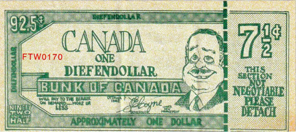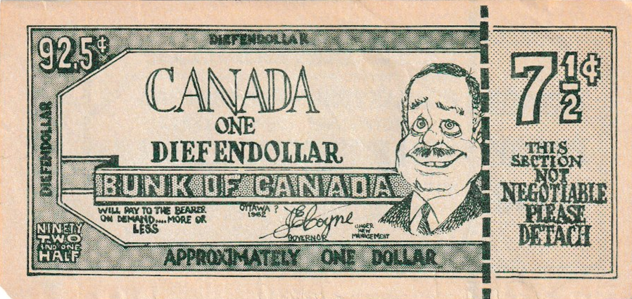 On se souviendra que le 2 mai 1962, à l’aube d’une campagne électorale, le gouvernement conservateur canadien institue une nouvelle parité pour le dollar canadien, le fixant à 0,9250 US$. Ce qui déclenche immédiatement une vive réaction de l’opposition libérale… et, peu après, la diffusion de plusieurs billets politiques et satiriques. Le Diefendollar aurait fait sa première apparition en Colombie-Britannique et, selon Lub Wojtiw, il émanerait du Parti Libéral ; ce qui est plausible, mais malgré nos recherches, n’a pu être confirmé. L’un de nos lecteurs pourra peut-être nous en apprendre plus.