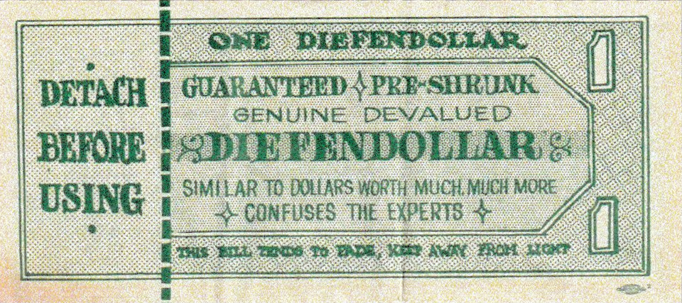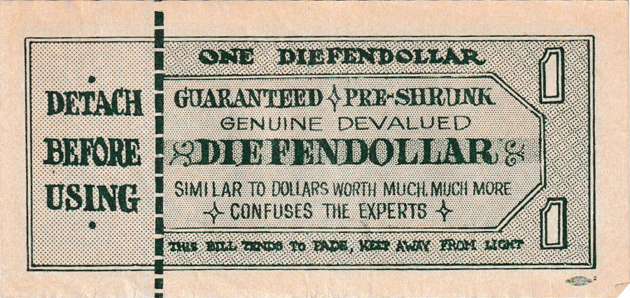 Le verso du billet stipule que le Diefendollar est garanti d’être prérétréci, et que bien qu’il soit similaire à d’autres dollars, il va confondre les experts. On avertit les utilisateurs de garder le billet loin de la lumière, car il risque de disparaître.