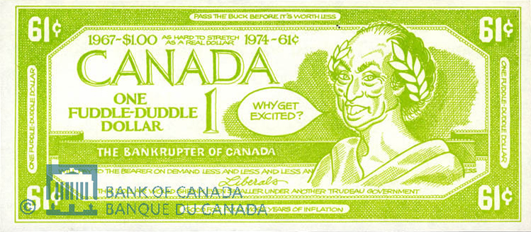 Cette expression et la dénomination sur un billet qui en a découlé font référence à un incident ayant eu lieu à la Chambre des Communes en février 1971. Trudeau avait alors lancé “F*ck off” à ses opposants et il avait ensuite indiqué que tout ce qu’il voulait dire, c’était « fuddle duddle ». L’expression s’était rapidement répandue…