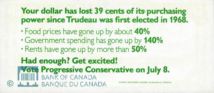 Lors de la campagne qui mena aux élections fédérales du 8 juillet 1974, le parti Progressiste-conservateur, alors dirigé par Richard Hatfield, reprochait (entre autres choses) au gouvernement libéral de Pierre Elliott Trudeau l’inflation qui s’était produite au cours des quatre dernières années. Le billet émis alors soulignait donc que le dollar avait perdu 39 cents depuis 1968 et insistait sur trois problèmes économiques découlant des politiques libérales : hausse du prix des aliments, augmentation du prix des loyers et croissance des dépenses gouvernementales.
