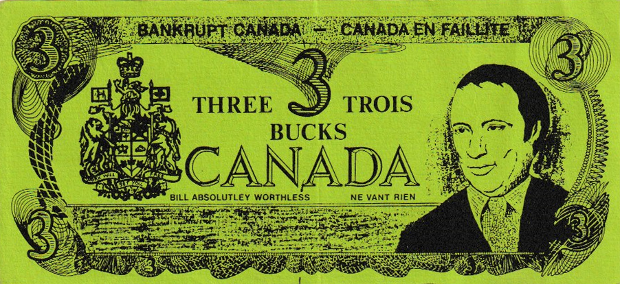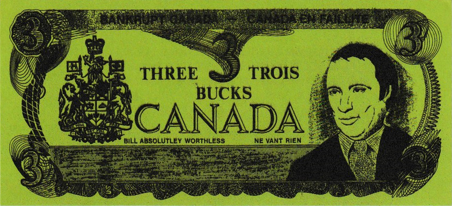 Le concept du billet n’est pas très élaboré : l’avers est très largement inspiré du 1 $ de la série courante de 1969 (scènes du Canada), le portrait de Pierre Elliot Trudeau remplaçant celui de la Reine. On peut en outre relever deux erreurs (coquilles ?) dans les inscriptions : Bill absolutley [absolutely] worthless Ne Vant [Vaut] rien.