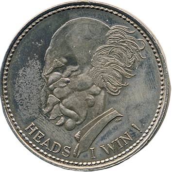 Profil de Pierre Elliott Trudeau; inscription « Heads I win ! ».