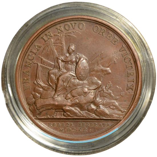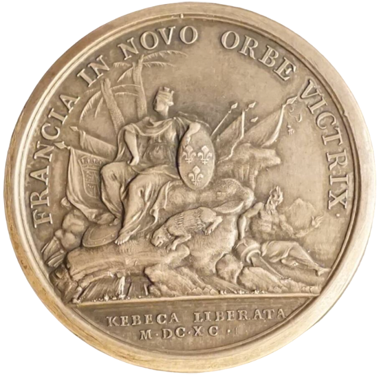 Cette pièce, considérée comme la première médaille de l’Amérique française, trouve son origine dans l’une des plus illustres batailles du XVIIe siècle au Québec entre les troupes françaises et leurs ennemis anglais :