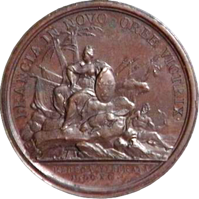 Revers : Francia In Novo Orbe Victrix. La Ville de Québec assise sur un rocher, ayant à ses pieds des pavillons et des étendards aux armes d’Angleterre. Elle a près d’elle un castor, animal fort commun au Canada. Au pied du rocher, le fleuve Saint-Laurent personnifié est appuyé sur son urne versante.