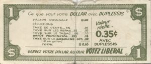 Émis pour inciter les électeurs à voter pour les représentants du Parti Libéral, ce billet critique les politiques du gouvernement dirigé par Maurice Duplessis en matière d’impôt et de taxes. L’impôt provincial a été créé en 1954 et Duplessis est mort le 7 septembre 1959; l’on peut donc raisonnablement penser que le Votez Libéral a été distribué à l’occasion des élections provinciales qui ont lieu en 1956.