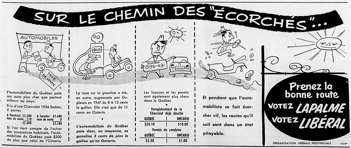 Cette hypothèse semble d’autant plus plausible que la préoccupation pour le coût de la vie exprimée sur ce billet se manifeste également dans une publicité du Parti Libéral parue dans L’Action populaire le 6 juin 1956 ; et avec les mêmes données.