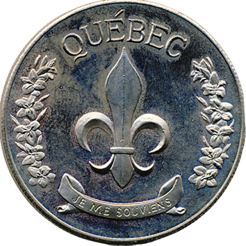 Au centre, une Fleur de lys, en haut, l’inscription Québec en exergue; en bas, dans, un ruban, la devise du Québec, « Je me souviens ».